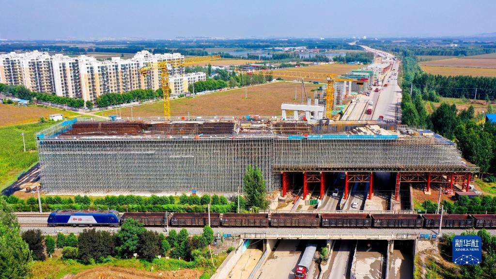 9月29日拍攝的濟(寧)曲(阜)快速路上跨京滬鐵路立交橋項目(無人機照片)。