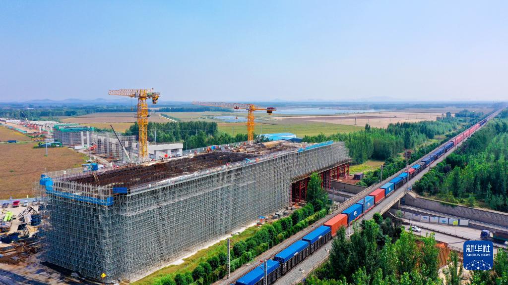 9月29日拍攝的濟(寧)曲(阜)快速路上跨京滬鐵路立交橋項目(無人機照片)。