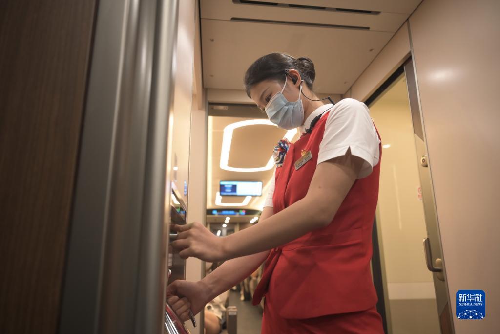 首發車G9801次列車長車艷雪和她的同事登上福廈高鐵復興號智能動車組為乘客服務?!霸诹熊嚿衔覀円眯挠们樽龊梅?,讓乘坐福廈高鐵的乘客在旅行中享受到不一樣的跨海之旅,展現我們海上‘高姐’的風采?!避嚻G雪說。