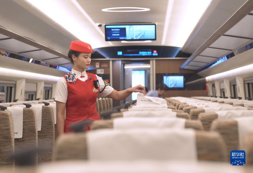 首發車G9801次列車長車艷雪和她的同事登上福廈高鐵復興號智能動車組為乘客服務?!霸诹熊嚿衔覀円眯挠们樽龊梅?,讓乘坐福廈高鐵的乘客在旅行中享受到不一樣的跨海之旅,展現我們海上‘高姐’的風采?!避嚻G雪說。