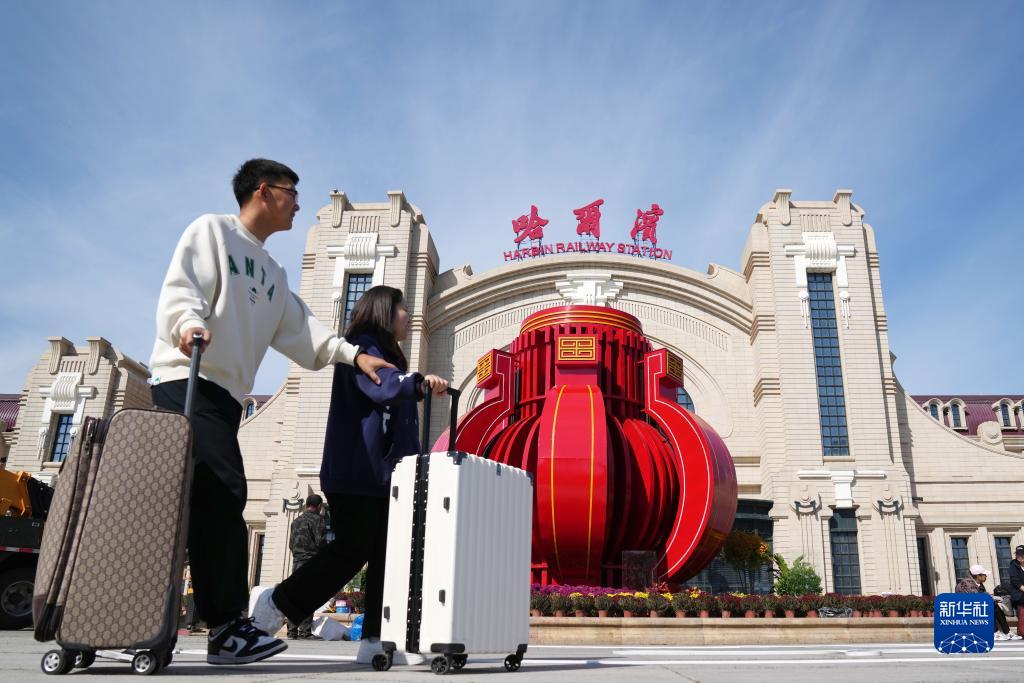 9月29日,旅客從哈爾濱火車站南廣場走過。