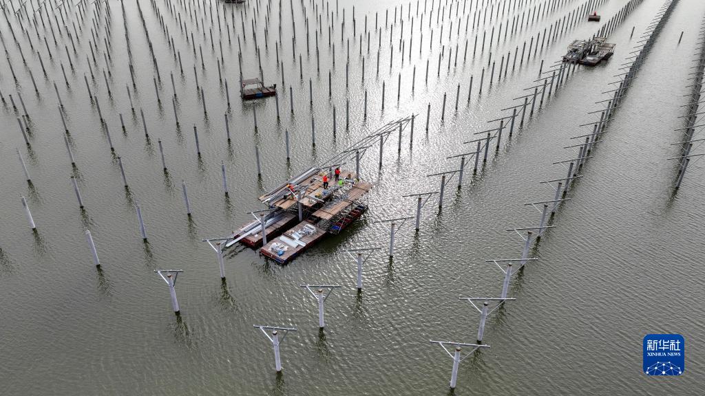9月29日,工人在河北省唐山市豐南區黑沿子鎮“漁光一體”現代漁業產業園二期工程建設工地施工。