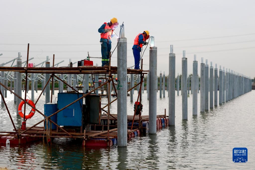 9月29日,工人在河北省唐山市豐南區黑沿子鎮“漁光一體”現代漁業產業園二期工程建設工地施工。