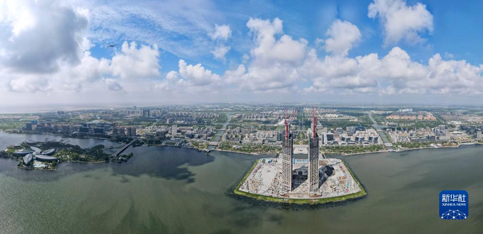 這是中國(上海)自由貿易試驗區臨港新片區,左上為東海大橋,前為建設中的中銀金融中心大樓(2023年9月6日攝,無人機全景照片)。