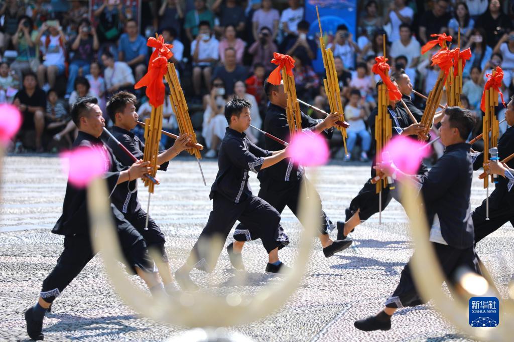 9月29日,游客在貴州省黔東南苗族侗族自治州雷山縣西江千戶苗寨景區觀看民族歌舞表演。