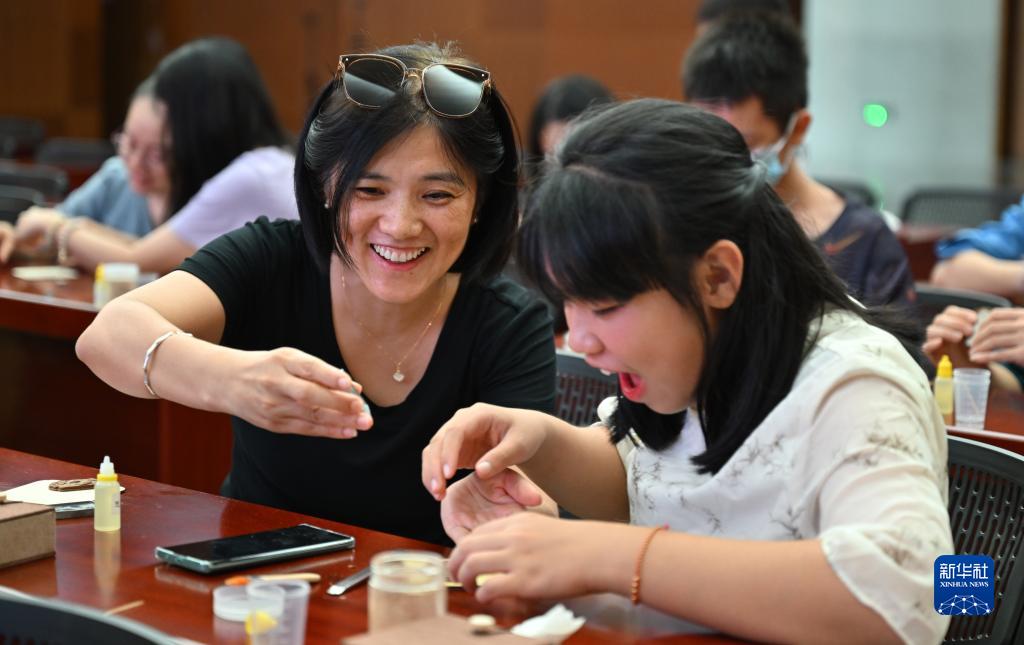 9月29日,家長帶著孩子在位于海南省??谑械暮D鲜〔┪镳^參加古法制香牌活動。