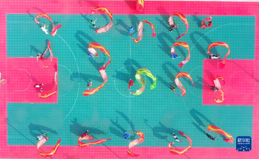 9月29日,在山東省聊城市茌平區賈寨鎮文體廣場,舞龍愛好者進行集體舞龍表演(無人機照片)。