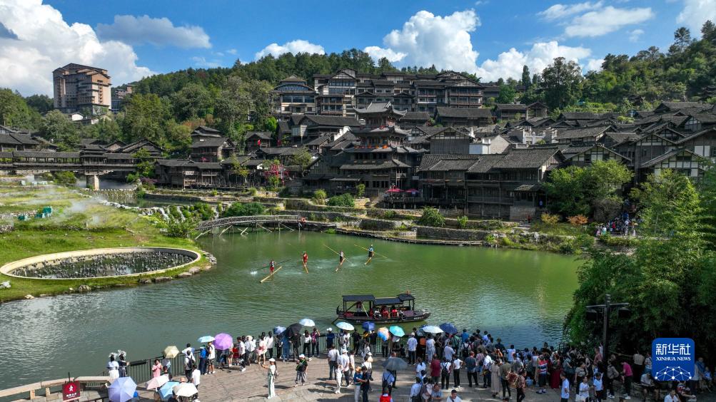 9月29日,游客在貴州省遵義市播州區烏江古寨景區觀看獨竹漂表演(無人機照片)。