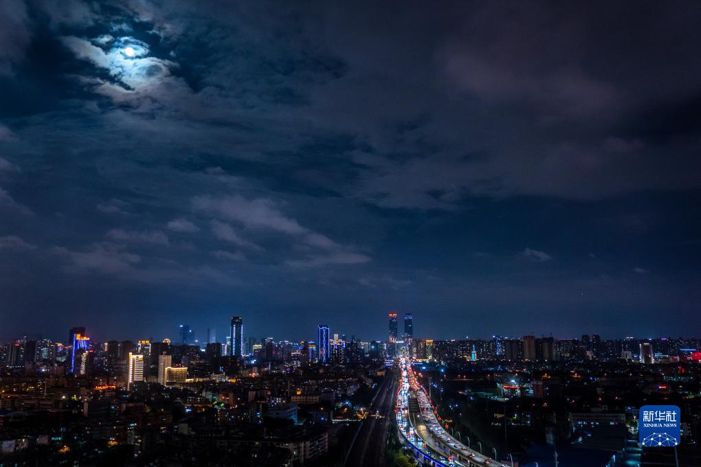 這是9月29日在云南省昆明市拍攝的月亮與城市景觀。