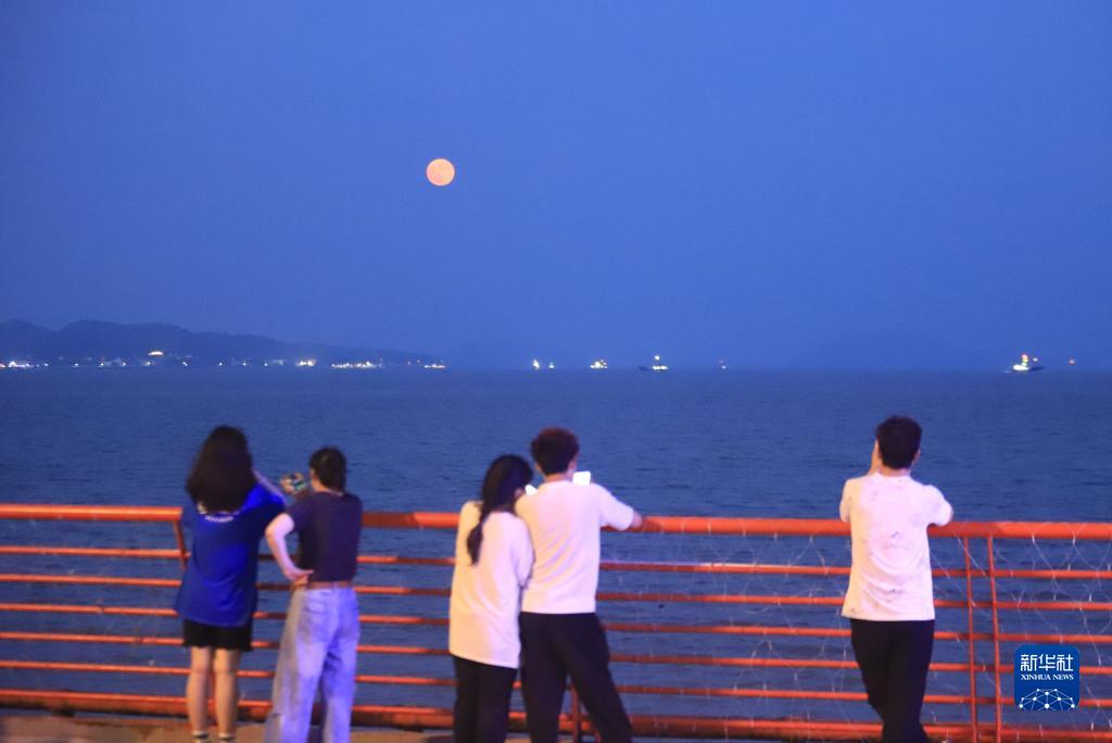 9月29日,在浙江省舟山市,人們在海邊賞月。