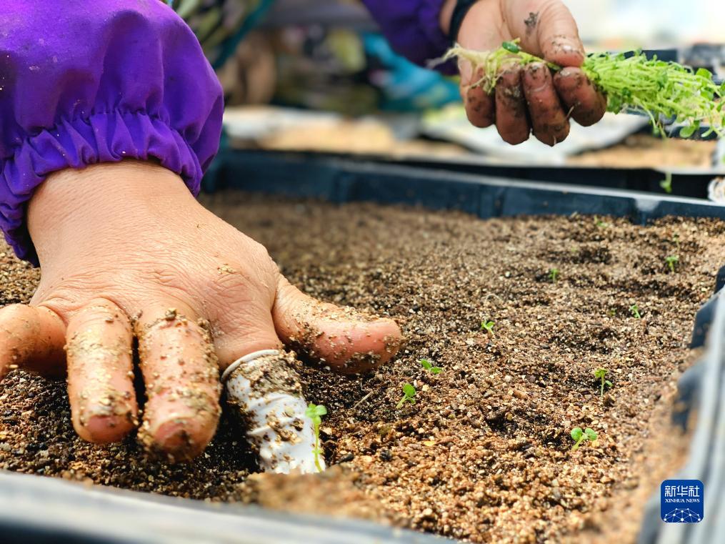 5月21日,當地農民將原原種幼苗栽進培養土中。