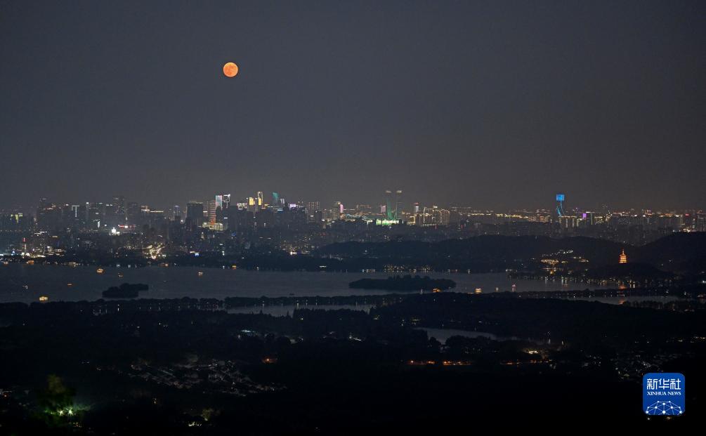 中秋佳節當晚,一輪滿月高懸在杭州上空,吸引眾多市民游客觀賞。