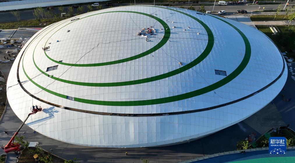 9月30日,建設者在河北省石家莊市高鐵片區中央綠色體育公園網球館施工。