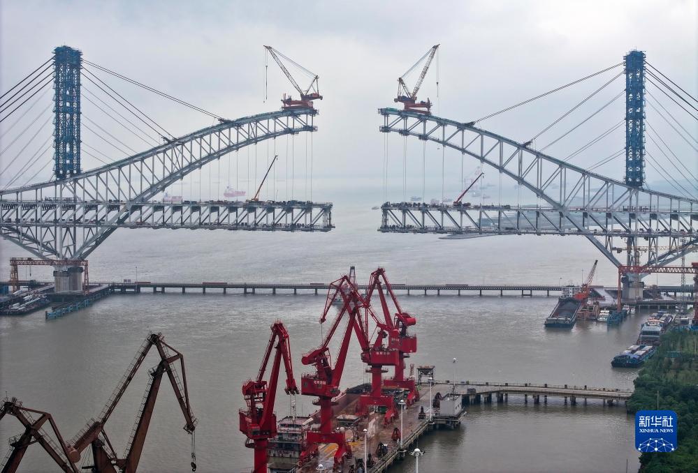 9月30日,中交二航局工人在位于江蘇省泰州市的常泰長江大橋建設項目工地作業(無人機照片)。