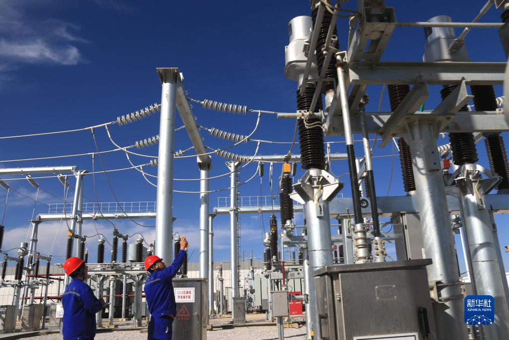 9月30日,工作人員在甘肅省敦煌市北湖風電基地海裝紅柳風電場110千伏升壓站巡檢設備運行情況。
