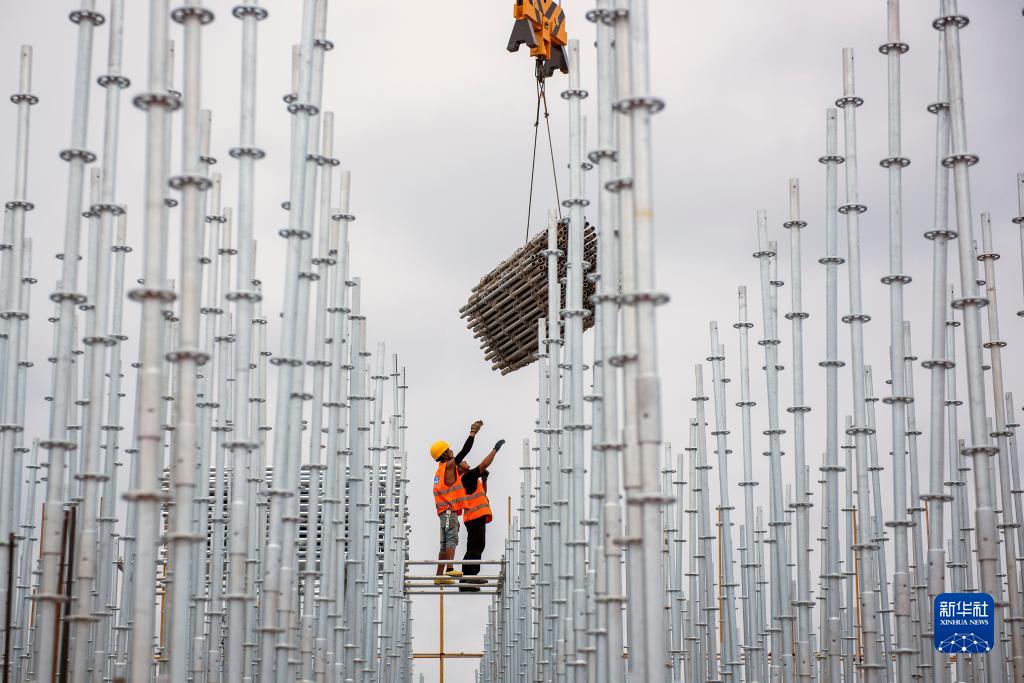 9月30日,在湖南婁底經開區的半導體顯示新材料產業園項目現場,中建一局的建設者在施工作業。