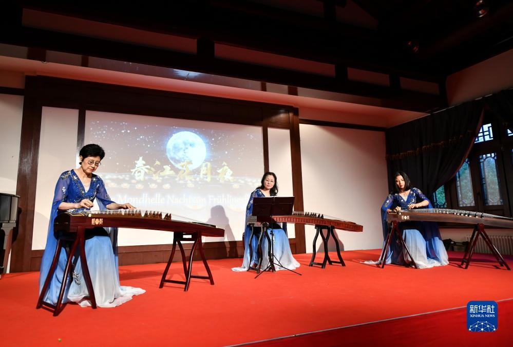 9月29日,在德國漢堡豫園,古箏愛好者在中秋晚會上演奏《春江花月夜》。
