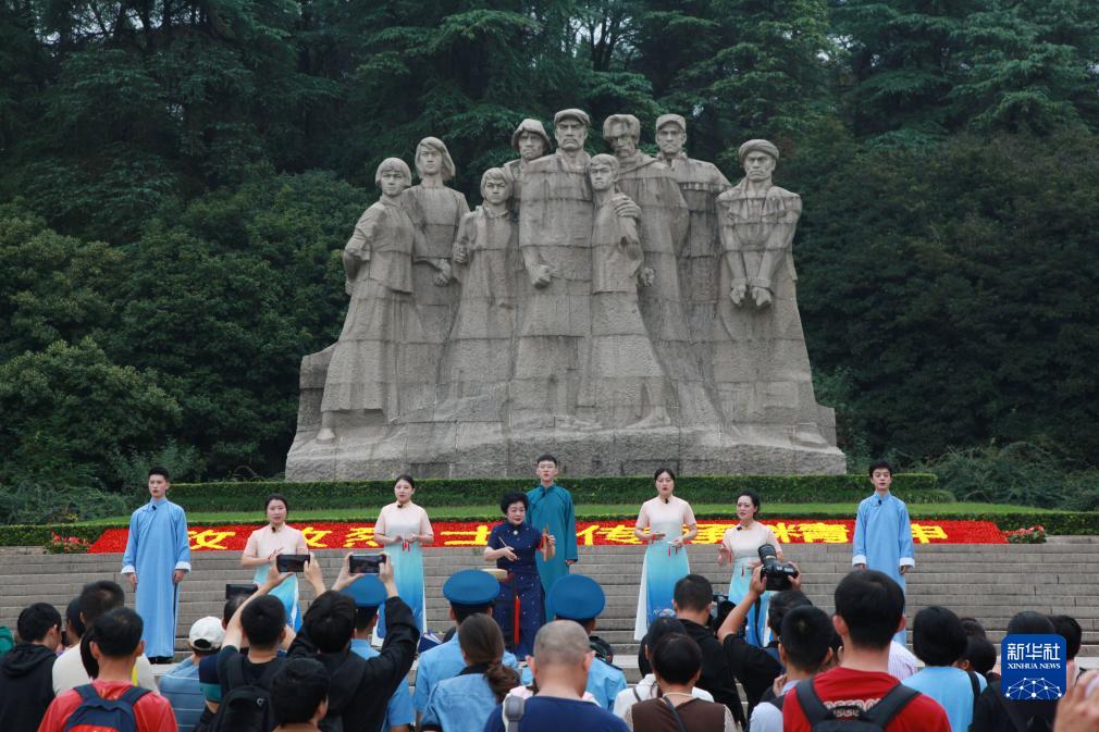 9月30日,在江蘇南京雨花臺烈士陵園的烈士就義群雕前,演員們表演南京白局《雨花臺的殷紅記憶》。