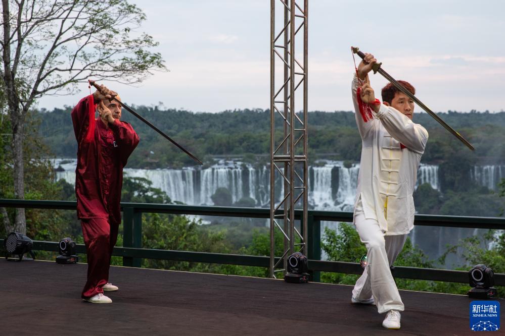 9月29日,演員在巴西伊瓜蘇舉行的中秋晚會上進行武術表演。