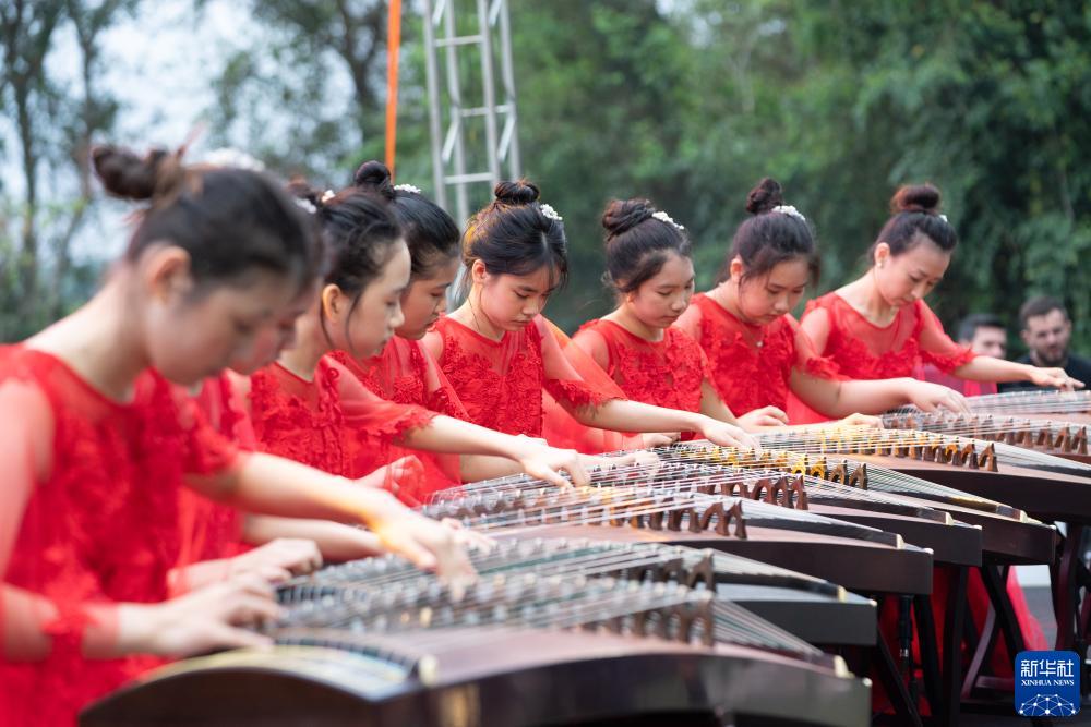 9月29日,演員在巴西伊瓜蘇舉行的中秋晚會上演奏古箏。