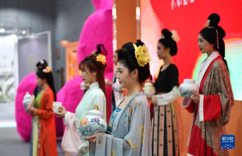 9月28日,在2023湖南(醴陵)國際陶瓷產業博覽會上,漢服愛好者在展示陶瓷。