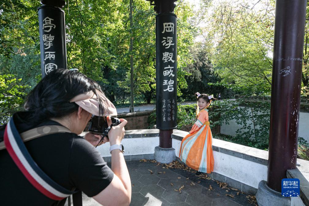 中秋、國慶“雙節”到來之際,德國法蘭克福的中式園林“春華園”于9月30日舉辦漢服游園會,漢服展示、舞蹈表演、中國傳統文化體驗等多種活動吸引了眾多游客參加。