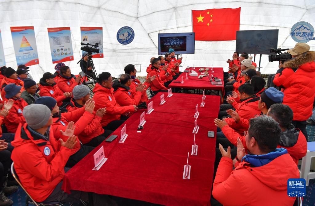 在海拔約4950米的卓奧友峰科考指揮大本營,第二次青藏高原綜合科學考察研究卓奧友峰科考現場總指揮安寶晟宣布,卓奧友峰峰頂各項科學考察活動圓滿完成(10月1日攝)。