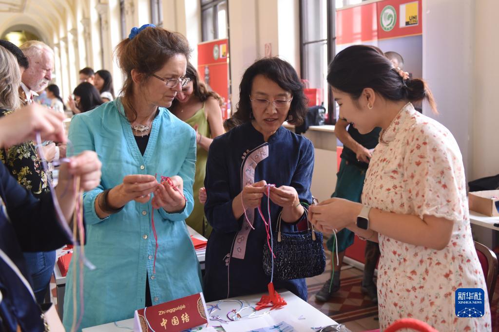 9月30日,在奧地利格拉茨大學活動現場,人們體驗編織中國結。