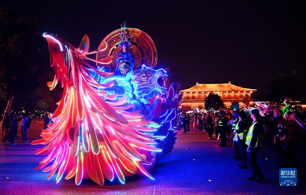 游客在西安大明宮國家遺址公園觀看彩車巡游(9月30日攝)。