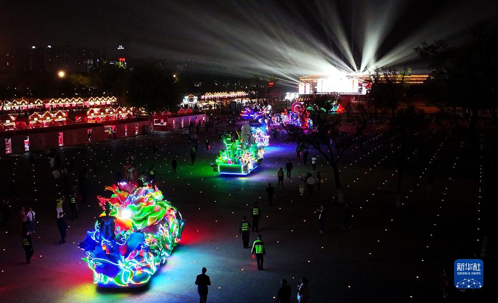 巡游彩車在西安大明宮國家遺址公園御道廣場行駛(9月30日攝,無人機照片)。