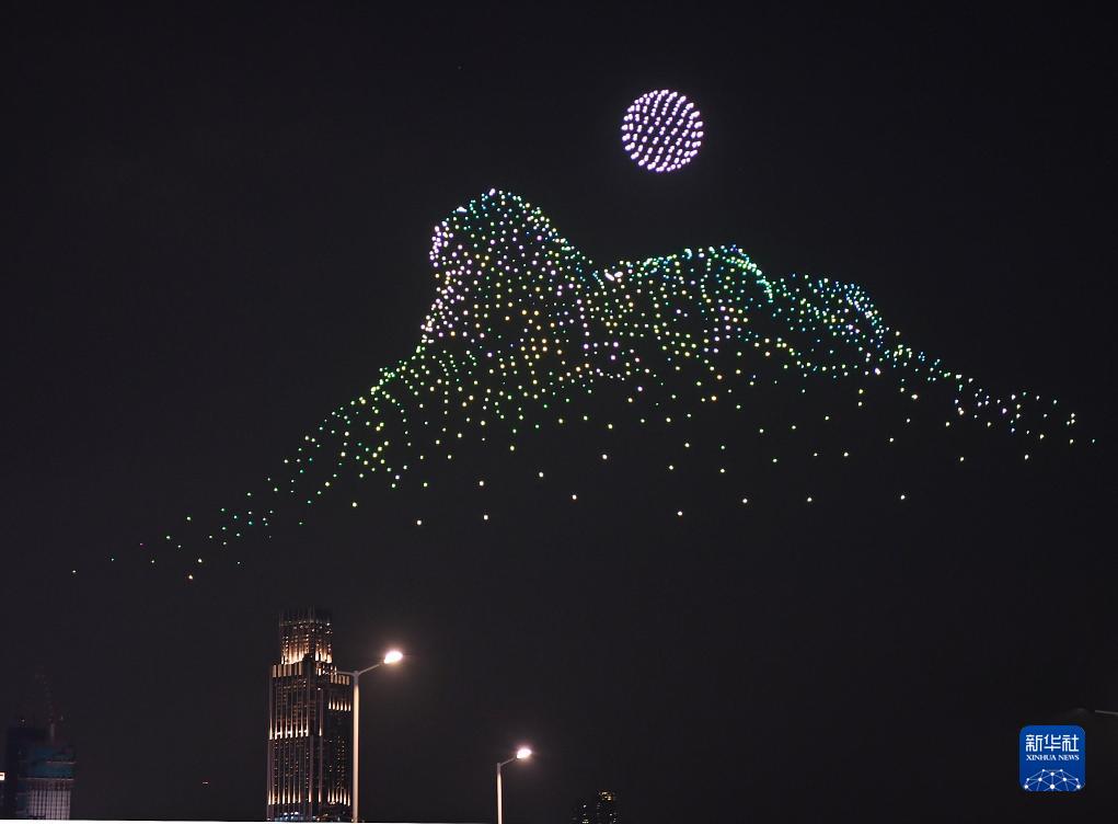 9月30日,無人機在維港上空拼成“月亮升起照亮獅子山”造型。