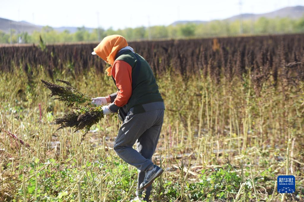 10月1日,在沽源縣白土窯鄉小西溝村,種植戶王秀梅在田間撿拾收割機收割后剩余的藜麥。
