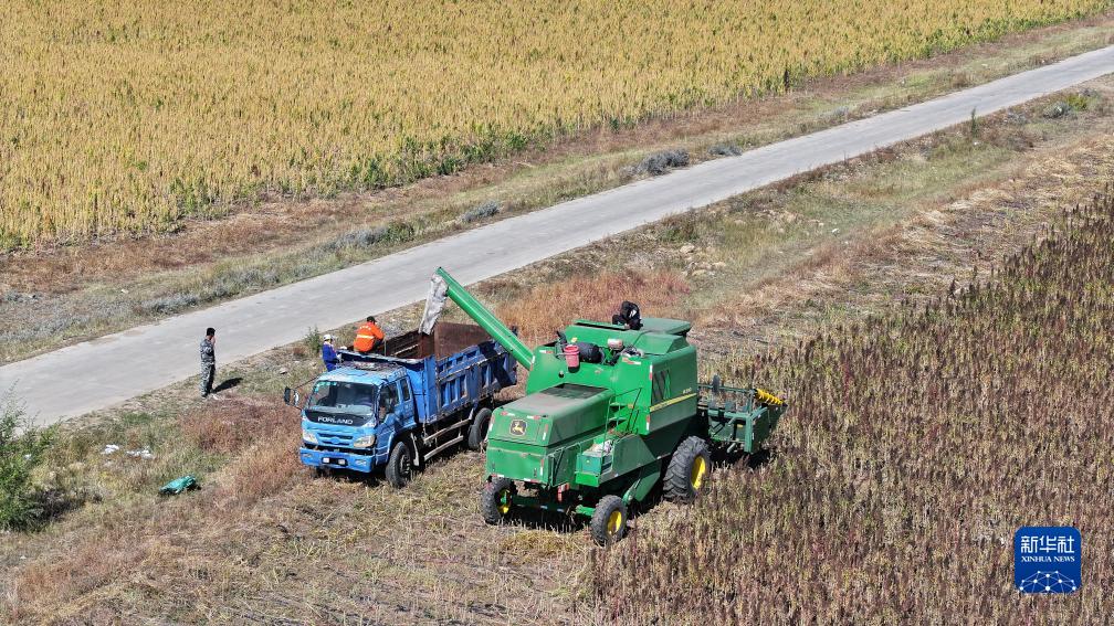 10月1日,在沽源縣白土窯鄉小西溝村,當地農機手將藜麥裝車裝備外運(無人機照片)。