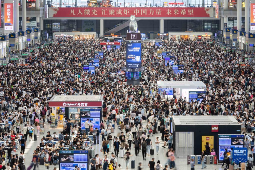 10月1日,上海虹橋火車站候車大廳里人頭攢動。