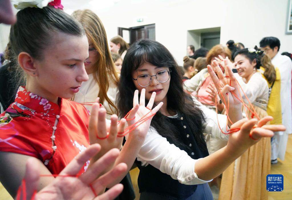9月25日,在拉脫維亞大學孔子學院舉辦的中秋節慶?;顒由?,一名拉脫維亞女孩體驗中國傳統游戲翻繩。