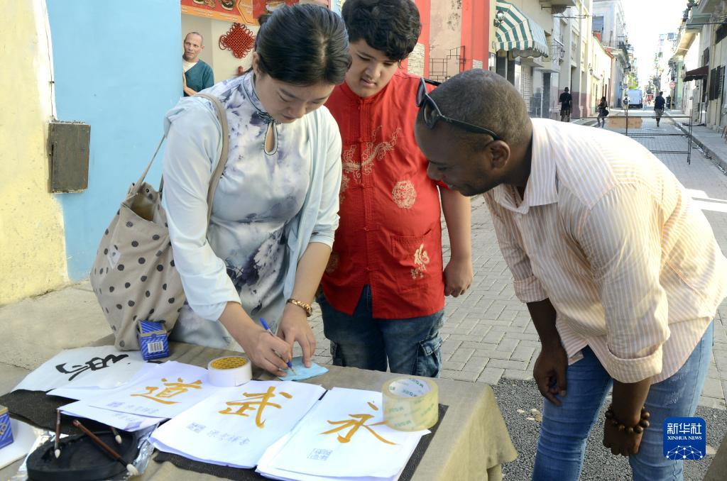 9月29日,在古巴哈瓦那大學孔子學院舉辦的中秋節慶?;顒又?,中文教師與古巴民眾交流書法。