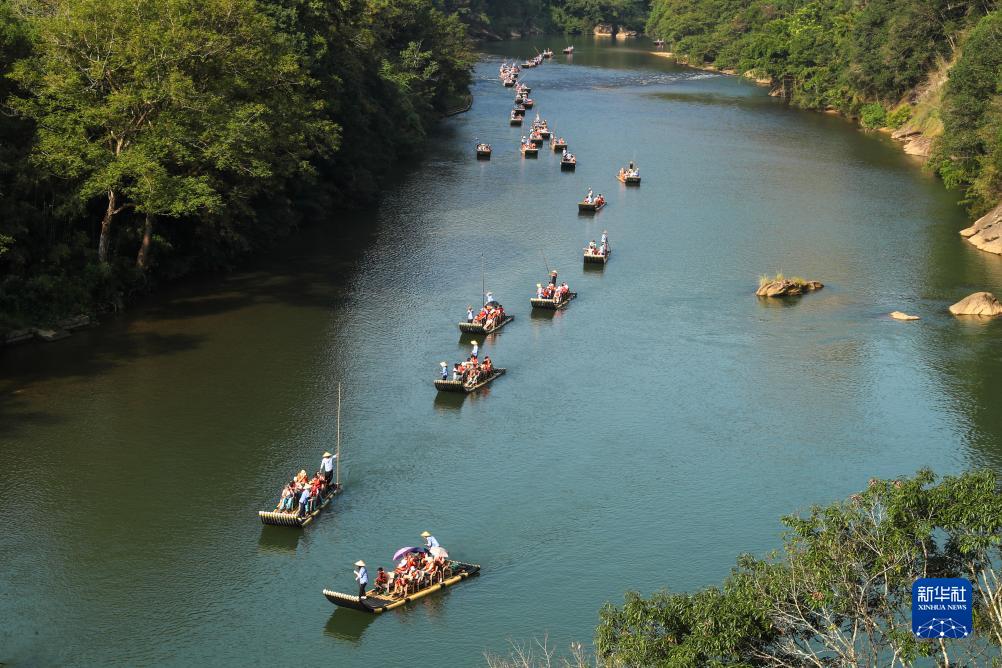 10月1日,游人乘坐竹筏欣賞武夷山國家公園九曲溪兩岸風景。