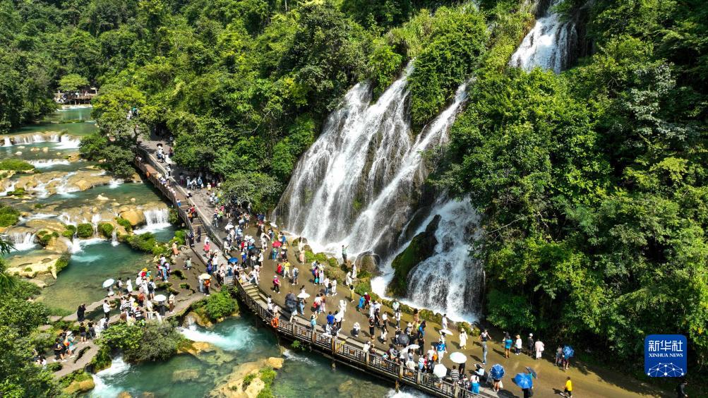 10月1日,游客在貴州省黔南布依族苗族自治州荔波縣小七孔景區觀光游玩(無人機照片)。