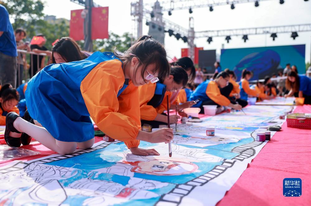 10月1日,在江蘇省泰興市萬達廣場,百名兒童在百米長卷上作畫。