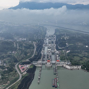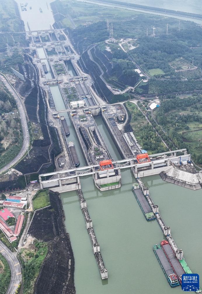 10月1日,船舶有序通過三峽雙線五級船閘(無人機照片)。