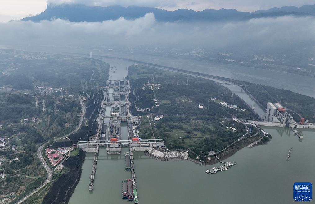 10月1日,船舶有序通過三峽雙線五級船閘和升船機(無人機照片)。