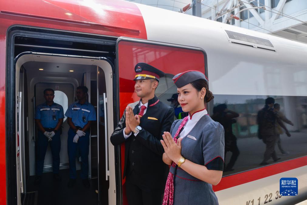 10月2日,在印度尼西亞帕達拉朗車站,乘務人員歡迎乘客和嘉賓。