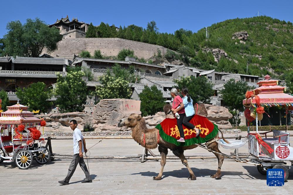 在山西磧口古鎮,村民劉金兔(左)拉著駱駝在古鎮行走(8月2日攝)。劉金兔之前在建筑工地打工。2016年,他看見來古鎮旅游的客人越來越多,和家人商量后,買了駱駝在景區供游客騎乘。