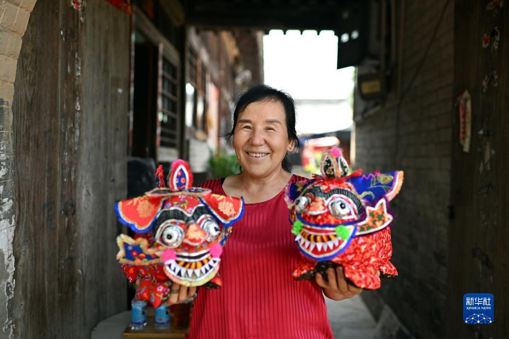 在山西磧口古鎮,村民馮延愛展示自己制作的布老虎(8月2日攝)。近年來,到磧口古鎮觀光的游客越來越多,馮延愛制作的布老虎和布鞋得到游客的青睞??夸N售布老虎和布鞋,馮延愛一年收入3萬多元。