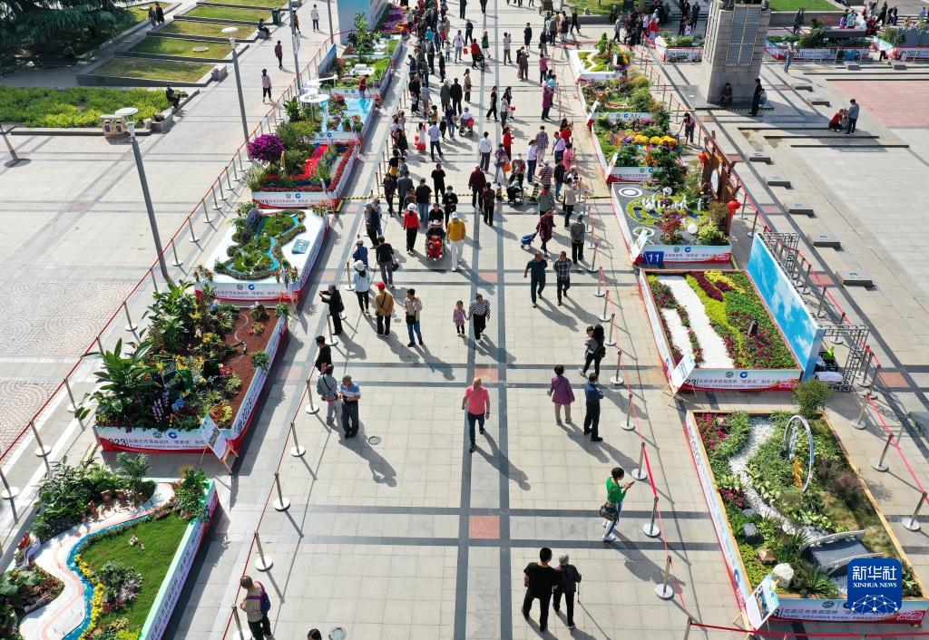 10月2日,市民和游客在石家莊市首屆園林“微景觀”制作大賽成果展上參觀(無人機照片)。