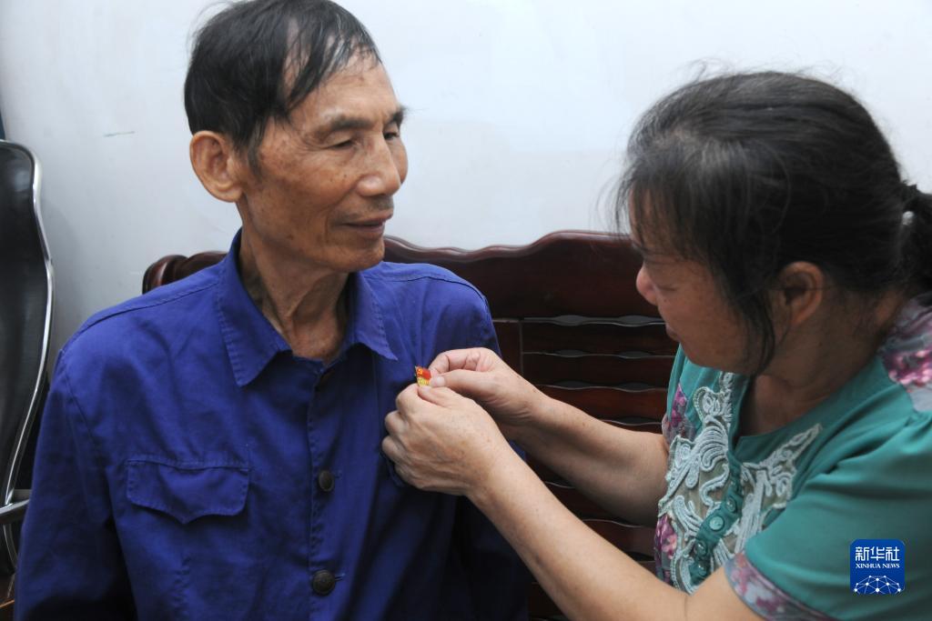 10月2日,梁樂的愛人幫他戴上黨徽。
