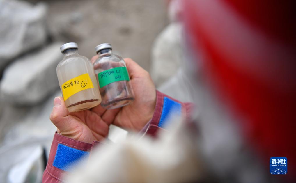 科考隊員查看采集到的水樣,通過水樣可以觀測到湖水釋放的甲烷、二氧化碳等氣體的濃度(10月1日攝)。