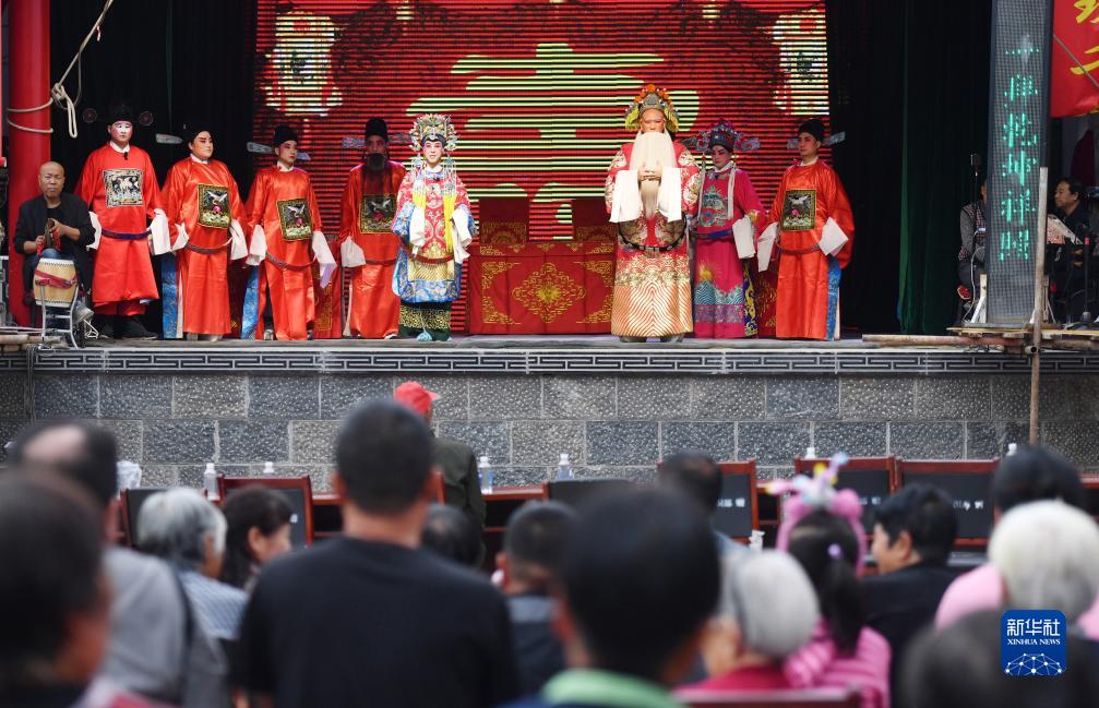 10月2日,當地群眾在河北省石家莊市井陘縣張家莊村觀看井陘晉劇團表演的傳統曲目《滿床笏》。
