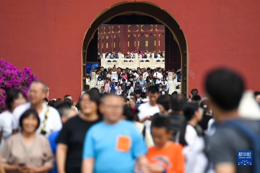 當日正值國慶假期,在北京天壇公園,來自各地的游客在這里參觀游覽。