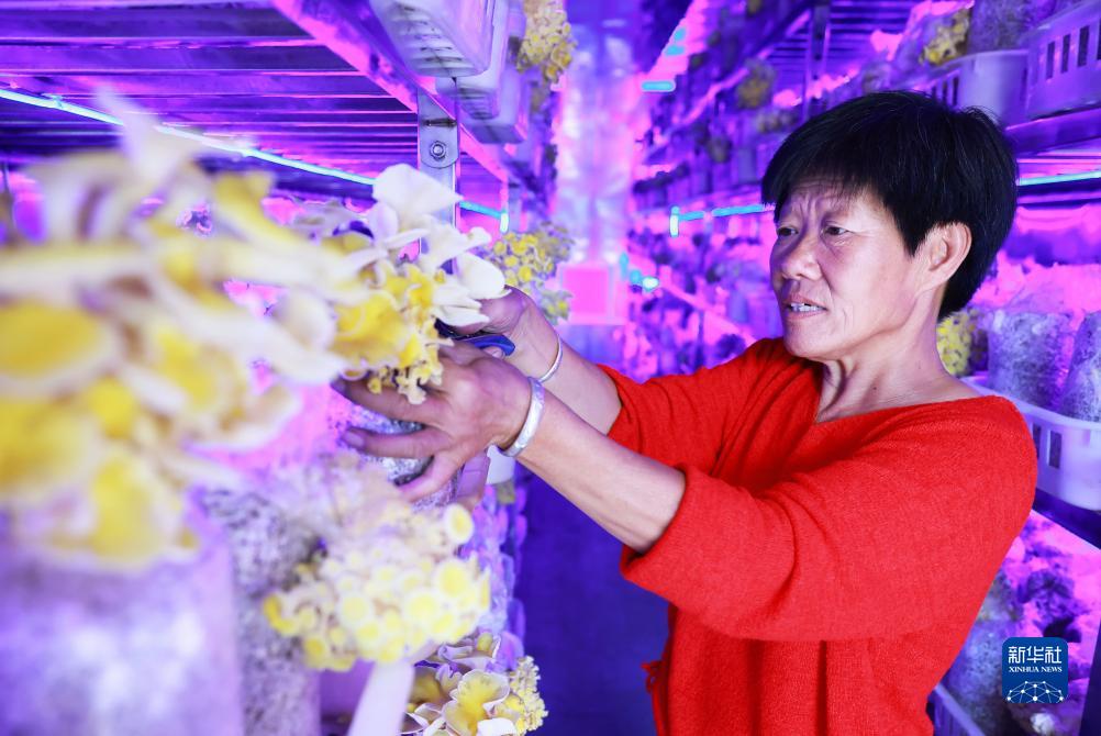 10月2日,河北省新河縣西流鄉南馬莊村一家榆黃蘑種植合作社的社員在采摘榆黃蘑。